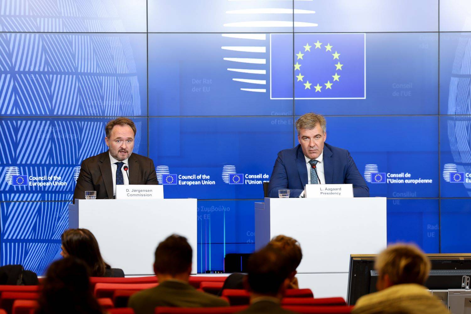 Energikommissær Dan Jørgensen og Danmark sin klima-, energi- og forsyningsminister Lars Aagaard heldt ei felles pressekonferanse i etterkant av energirådsmøtet 20. oktober. Foto: European Union