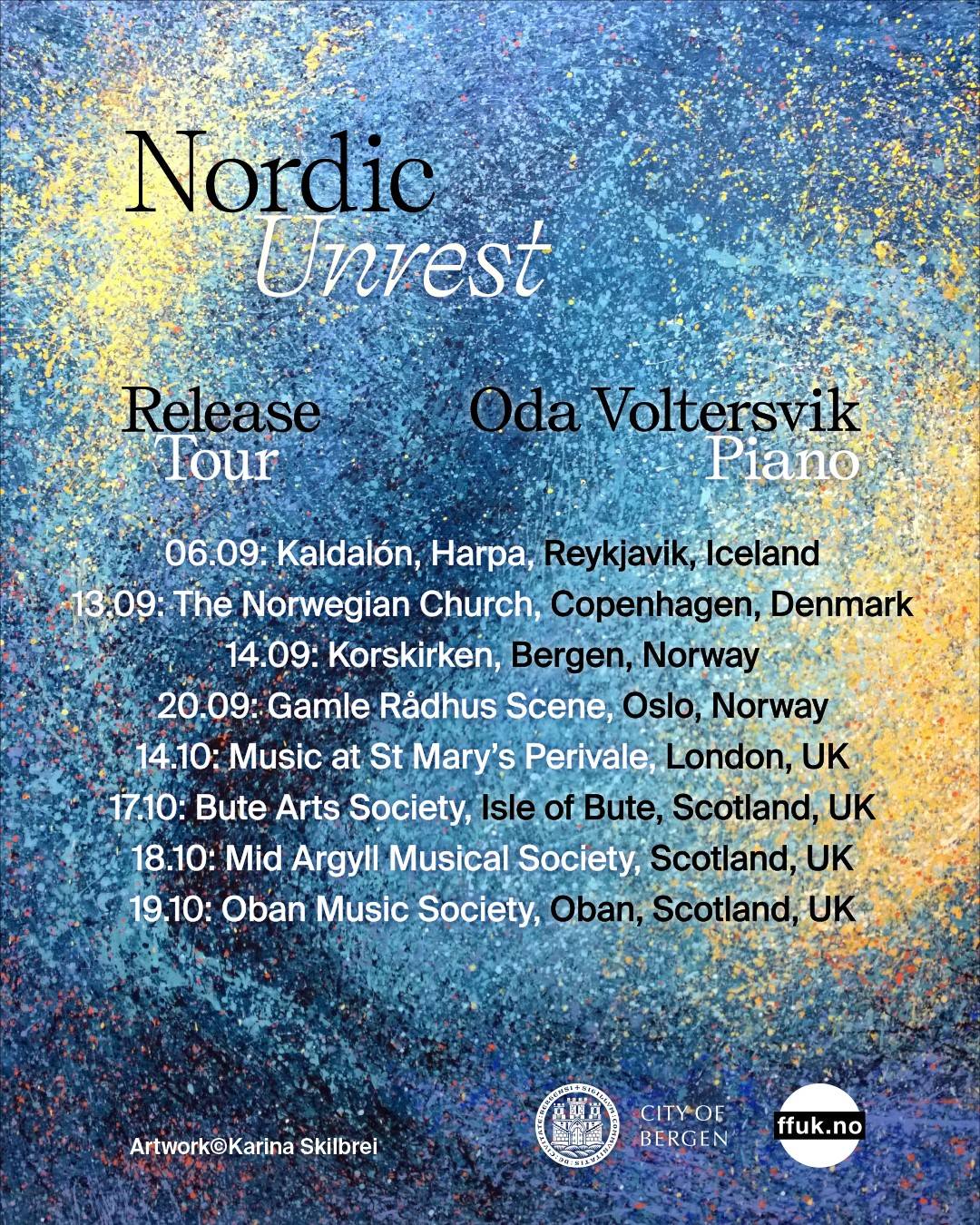London & Scotland, 14, 17, 18, 19 October: Nordic Unrest is a new solo piano album by the Norwegian pianist Oda Voltersvik. This deeply expressive recording explores the dramatic landscapes and folkloristic characters of the Nordic region. The composers Edvard Grieg and Atli Heimir Sveinsson are separated by a century but united in their ability to combine unrest with musical poetry.